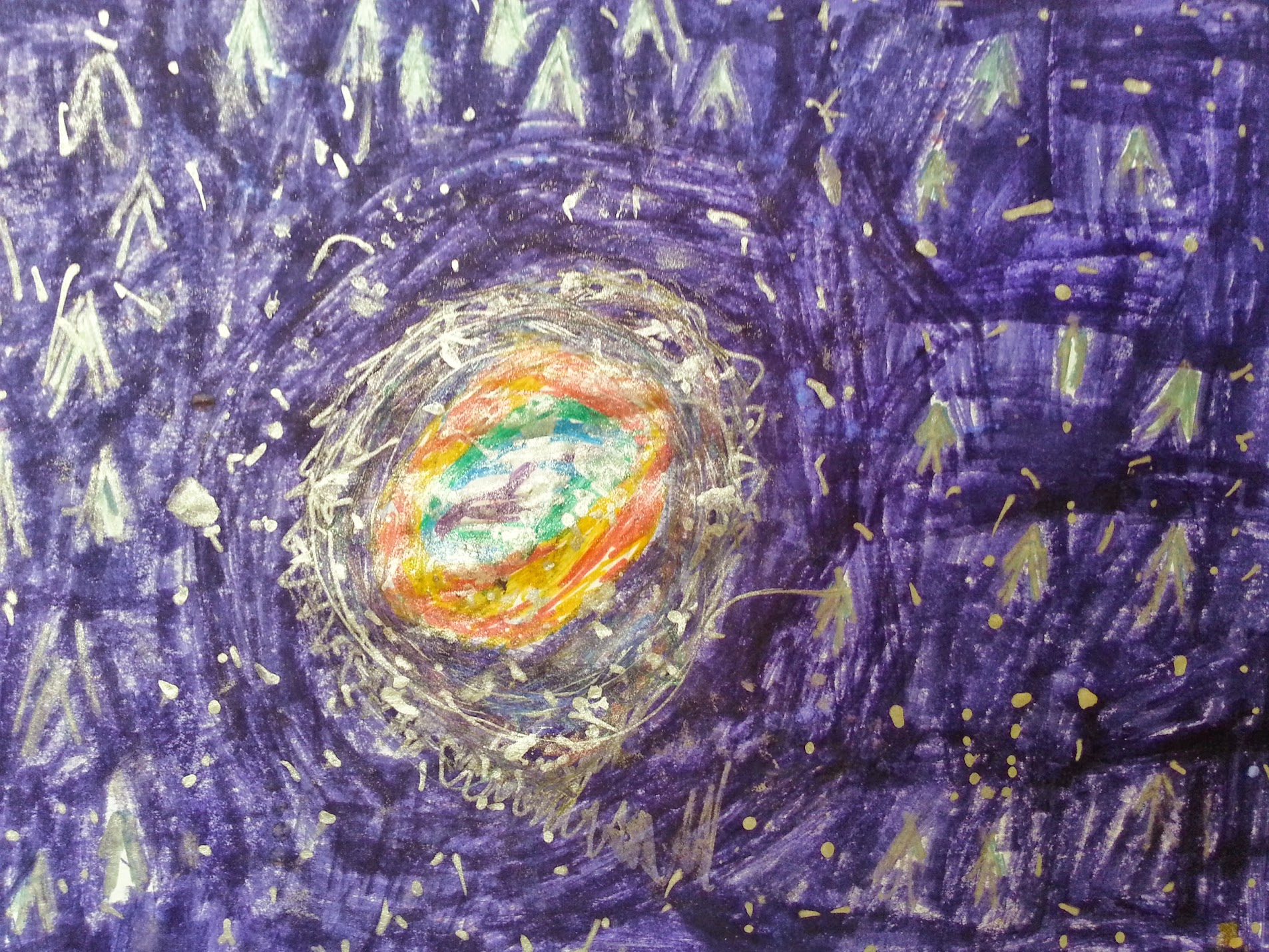 Art by Maya Samudrala (age 7) after seeing the Dumbell (M27) and Ring (M57) nebulae (composite), as well as Saturn, through my telescopes.
